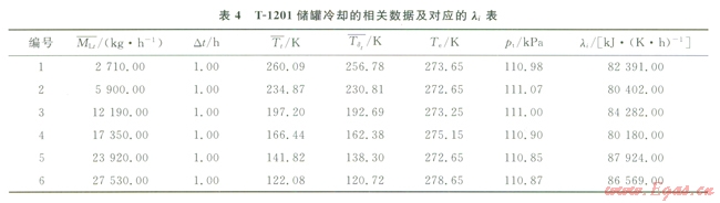 16×104m3常壓全容式混凝土頂儲罐的結(jié)構(gòu)及保溫材料都是相同的,因此,以大連LNG接收站T-1201儲罐冷卻時的數(shù)據(jù)來確定l。l同時也可作為模型的一個修正參數(shù),使所建立的模型更符合冷卻時的實(shí)際情況。表4為T-l201儲罐冷卻的相關(guān)數(shù)據(jù)及對應(yīng)的l值。