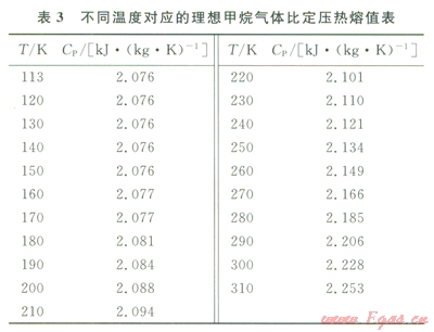 對于hBt的確定,首先通過EPCON Engineer′s Aide Toolbox 7.0軟件查詢出理想甲烷氣體不同溫度時所對應(yīng)的比定壓熱熔Cp(表3),再運(yùn)用matlab擬合出Cp與T的關(guān)系函數(shù)。