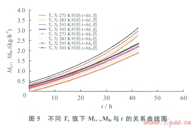 由于冷卻速度不同會導(dǎo)致瞬時進(jìn)入儲罐的LNG流量和冷卻所需的LNG需求量不同,同時導(dǎo)致瞬時排出儲罐的BOG流量和冷卻過程總共排出的BOG量也不同。當(dāng)儲罐壓力為111kPa,環(huán)境溫度為293K,儲罐冷卻初始溫度為293K,冷卻速度分別為-1.5K/h、-2.5 K/h、-3.5K/h、-4.5K/h時,冷卻過程中冷卻時間(t)與LNG流量(MLt)、排放BOG流量(MBt)間的關(guān)系如圖3所示,冷卻過程中儲罐溫度(Tt)與LNG流量(MLt)、排放BOG流量(MBt)間的關(guān)系如圖4所示。
