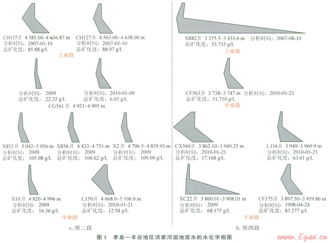 通過對(duì)孝泉 豐谷地區(qū)生產(chǎn)井歷年地層水洛瓦克相圖系統(tǒng)分析,選擇相同層位具有代表性且相同或相近時(shí)間段的樣品分析結(jié)果進(jìn)行對(duì)比,表明研究區(qū)須家河組同一地區(qū)縱向上地層水具相似特征,在同一局部構(gòu)造范圍內(nèi)底水和邊水并存,但地層水分布橫向連通性差,不同的構(gòu)造部位水體不連通,平面上分布規(guī)模較小,為獨(dú)立的氣水系統(tǒng)。
