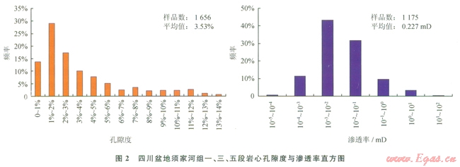 須三段儲(chǔ)集巖有砂巖、礫巖2種類型。砂巖儲(chǔ)層幾乎在全盆地均有分布,儲(chǔ)層孔隙度平均為4.43%,平均滲透率為0.25mD。以中壩地區(qū)物性最好,儲(chǔ)集巖主要為中粒巖屑石英砂巖、長(zhǎng)石石英砂巖及巖屑砂巖,巖心平均孔隙度達(dá)7.52%,平均滲透率為0.3mD,粒間溶孔和粒內(nèi)溶孔發(fā)育。礫巖儲(chǔ)層僅分布在川西北劍閣地區(qū),礫石成分以碳酸鹽巖為主,礫間充填砂質(zhì),孔隙主要發(fā)育于基質(zhì)砂巖,孔隙度較低,主要分布在2%~4%。巖心與薄片觀察,裂縫發(fā)育,有時(shí)呈組出現(xiàn)或呈網(wǎng)狀,發(fā)育的裂縫溝通了低孔隙度礫巖儲(chǔ)層,改善了儲(chǔ)層的滲透性,孔隙與裂縫組成礫巖儲(chǔ)層儲(chǔ)集空間,形成“有效儲(chǔ)滲體” [15]。目前該區(qū)勘探發(fā)現(xiàn)多口工業(yè)氣井,表明孔隙度為2%~4%的砂礫巖,只要有裂縫的溝通,仍然可以形成有效儲(chǔ)層。平面上,儲(chǔ)層主要分布在川西地區(qū),以川西北劍閣—中壩地區(qū)最為發(fā)育,儲(chǔ)層厚度超過15m。