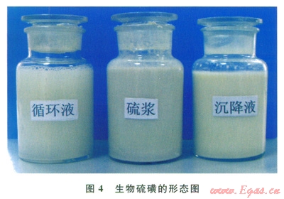 生物硫磺的生成機(jī)理和化學(xué)硫磺的生成機(jī)理不同[23],微生物通過(guò)自身特殊代謝過(guò)程,將生成的硫磺排出體外,同時(shí)又和微生物包裹在一起,因而硫磺在溶液中以乳濁液的形式存在,具有親水性(圖4)。通過(guò)實(shí)驗(yàn)測(cè)定了生物硫磺的密度、黏度和粒徑等物化指標(biāo),為生物硫磺后期處理方法的選擇提供了重要參考依據(jù)。