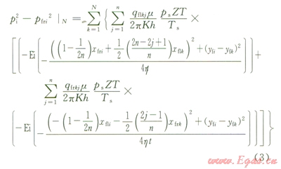 第i條裂縫就可以看成是一個以流動半徑為Ri,厚度為裂縫寬度wi,邊界壓力為裂縫尖端壓力p(xfi,yfi,t),滲透率為Kf,流壓pwf的微型氣藏,其流動方式可以看成徑向流,所以氣體在裂縫內(nèi)的流動過程可表示為:
