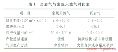 頁(yè)巖氣一般具有“低豐度、低滲透率、低產(chǎn)量”的特點(diǎn),與常規(guī)天然氣相比,屬于典型的“邊緣資源”(表1)。因此,開發(fā)頁(yè)巖氣須采用不同于常規(guī)天然氣的理念、思路與技術(shù)。