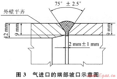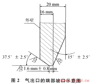 如前所述,在有效補(bǔ)強(qiáng)區(qū)域之外,接管的名義厚度可以取,為了方便與法蘭頸或外部管道對焊,需要對支管端部進(jìn)行削邊處理,形成與外部連接的焊接坡口,削邊后的最小厚度不得小于強(qiáng)度要求的名義厚度。氣出口的端部坡口如圖2所示。氣進(jìn)口的端部坡口如圖3所示。