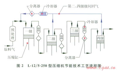 L-12/5-250型壓縮機第二、四級級間回氣未經(jīng)過冷卻和分離而直接與原料氣混合后進人一級壓縮缸壓縮,由于第二、四級級間回氣溫度高,接近壓縮缸出口溫度,與原料氣混合后必然提高一級進氣溫度,而且第二、四級級間回氣所含的凝液和潤滑油等進入一級壓縮缸,減少了原料氣的吸人量,惡化了各級壓縮缸的工況,增加了各級冷卻器、分離器的負荷,必然降低壓縮機組的效率。
