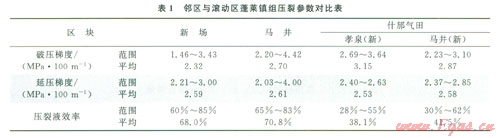 從表l可以看出,滾動區(qū)的平均破裂壓裂較延伸壓力高出0.3~0.62MPa/100m,說明鉆完井過程中由于工作液的濾失造成較為嚴(yán)重的近井污染,從而導(dǎo)致異常高的破裂壓力及施工初期較高的施丁壓力[1-2]。