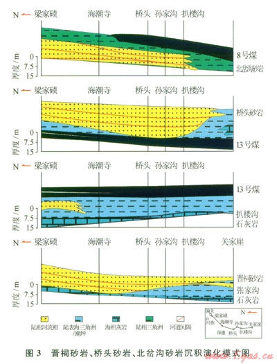 扒樓溝石灰?guī)r沉積時(shí)期的海侵之后,在濱海平原和潮坪環(huán)境的基礎(chǔ)上開(kāi)始泥炭沼澤化沉積,聚煤場(chǎng)所隨著海水的后退而不斷拓展,形成厚層泥炭堆積,形成了太原組主力煤層l3號(hào)煤層,是整個(gè)河?xùn)|煤田穩(wěn)定發(fā)育的煤層。橋頭砂巖的展布范圍較晉祠砂巖略廣,在北部以河道沉積為主,在魏家灘以南,過(guò)渡為向上變粗層序,屬三角洲前緣砂,部分地段見(jiàn)分流河道砂[1]。