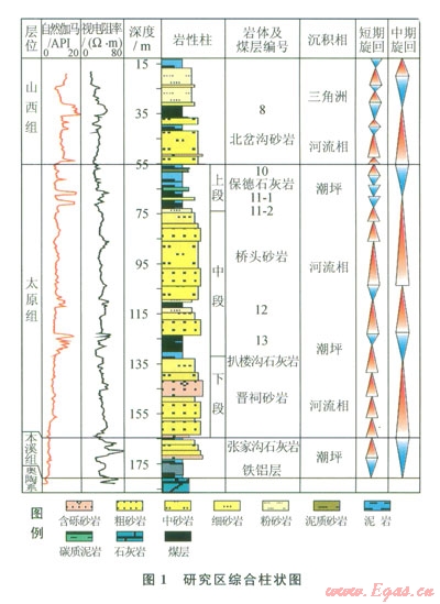 山西組以河流三角洲沉積體系為主,底界北岔溝砂巖,是一套灰白色的粗粒砂巖,與下伏地層呈整合接觸,厚度變化大,局部底部含礫,在橋頭鎮(zhèn)一帶過(guò)渡為細(xì)礫巖??梢?jiàn)由砂巖、粉砂巖、碳質(zhì)泥巖及煤層組成2~4個(gè)正粒序的沉積旋回。主采煤層為8號(hào)煤層,發(fā)育在第一旋回的上部,大部分地區(qū)穩(wěn)定可采(圖1)。