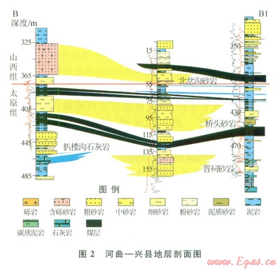 該區(qū)地層產(chǎn)狀平穩(wěn),構(gòu)造簡(jiǎn)單(基本上為單斜構(gòu)造),呈近南北走向、西或西偏北方向傾斜,傾角5~10℃,區(qū)內(nèi)發(fā)育一些產(chǎn)狀平緩、規(guī)模不大的褶皺構(gòu)造[1,4]。地層由東向西,由老到新出露,在府谷地區(qū)以北,由于后期構(gòu)造和黃河下切作用,出露中奧陶統(tǒng)。上石炭統(tǒng)和下二疊統(tǒng)為區(qū)內(nèi)含煤地層,除偏關(guān)、河曲局部地段,從南到北均有分布。橋頭鎮(zhèn)地區(qū)以北,有幾組較大規(guī)模的斷裂構(gòu)造,使保德賈家峁一帶抬起,山西組及其以上地層缺失。