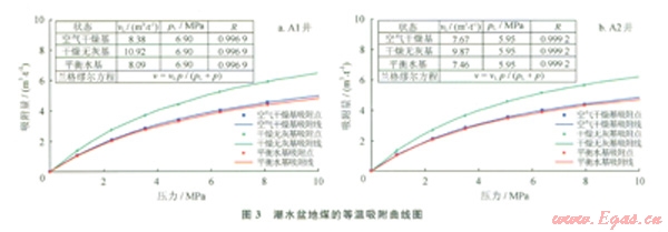 蘭氏體積反映了煤的最大吸附能力,蘭氏壓力反映煤層氣解吸的難易程度,值越高,煤層中吸附態(tài)氣體脫附越容易,越有利于開發(fā)跚。從Al、A2井的等溫吸附曲線上看(圖3),潮水盆地煤的蘭氏體積為7.46~10.92m3/t,對煤層氣的吸附能力強;而蘭氏壓力介于5.95~6.90MPa,值較高,利于煤層氣的解吸。