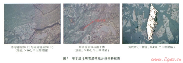潮水盆地宏觀煤巖類型以暗淡煤半晴煤為主。偏光顯微鏡下觀察(圖2),該區(qū)煤層惰質(zhì)組含量偏高,在成煤母質(zhì)器官或細(xì)胞的胞腔內(nèi)填充有黏土礦物,并含有黃鐵礦、石英、黏土等礦物,反映了當(dāng)時成煤環(huán)境比較復(fù)雜多變。煤巖鑒定分析表明,該區(qū)煤層鏡質(zhì)組含量介于29.0%~89.5%、平均為52.5%;惰質(zhì)組含量介于10.9%~55.2%、平均為38.9%;殼質(zhì)組含量偏高,為l.1%~l4.5%。