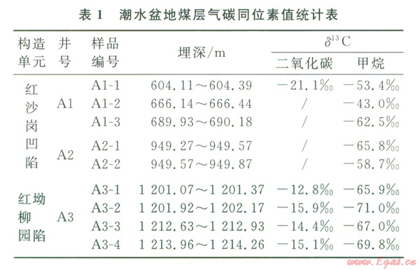 該區(qū)宏觀煤巖類型以暗淡煤和半暗煤為主,顯微煤巖組分鏡質(zhì)組含量低,生氣母質(zhì)條件較差;煤巖變質(zhì)程度低,為低煤階,熱成因氣量少,因此低煤階煤層氣成藏須要生物氣的補充。目前,國內(nèi)外學(xué)者普遍采用甲烷碳同位素值(δ13C1)來鑒別生物氣[9-11]。l989年,戴金星通過研究我國生物氣的氣組分及同位素組成特征,提出以δ13C1<-55‰作為鑒別生物氣的主要地化指標(biāo)[12]。
