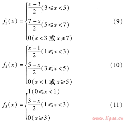 f1(x)、f2(x)、f3(x)、f4(x)、f5(x)——隸屬度函數(shù),依次為被評(píng)價(jià)因素對(duì)評(píng)價(jià)集V的5個(gè)評(píng)價(jià)指標(biāo)的隸屬度