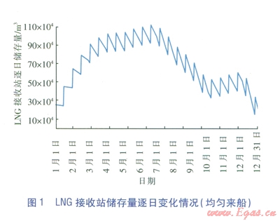 多氣源情況下,采用計算機編程進行接收站罐容模擬,可得出LNG接收站儲存規(guī)模、LNG接收站每月庫存情況及趨勢、上游LNG船次等,同時也可以通過調(diào)整LNG船的船期與LNG接收站一起對下游“平谷抑峰",在保證下游季節(jié)調(diào)峰要求的條件下降低LNG接收站的投資額。動態(tài)分析的方法可以用于設(shè)計前期確定LNG接收站儲存規(guī)模,確定經(jīng)濟合理的儲罐數(shù)量,也可以初步掌握均勻來船和船期調(diào)整后LNG接收站庫存變化情況。