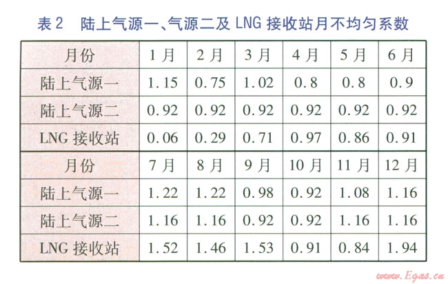 該地區(qū)共存在4種氣源供氣,其中陸上氣源一供氣量為30×108m3/a,陸上氣源二供氣量為18×108m3/a,陸上氣源三供氣量為36×108m3/a,LNG氣源供氣量為30×108m3/a。陸上氣源一和氣源二月供氣特性見表2;陸上氣源三為均勻供氣。LNG接收站用于承擔(dān)該地區(qū)除陸上氣源調(diào)峰外的所有季節(jié)調(diào)峰,可通過供需平衡和各氣源供氣特性計算出每月LNG接收站外輸量,得出LNG接收站供氣的月不均勻系數(shù)(見表2)。