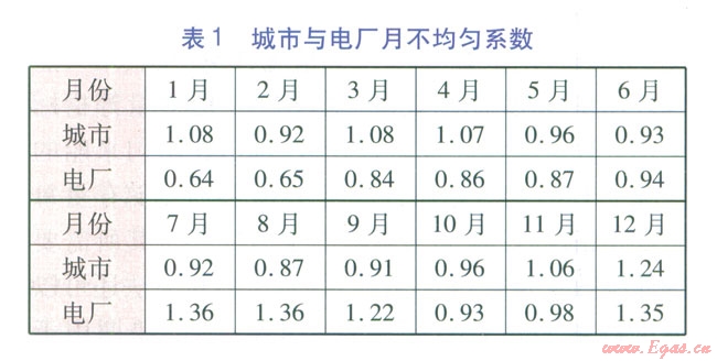 該地區(qū)天然氣主要用戶包括燃氣電廠和城市用戶,其中:城市用戶包括居民用戶、商業(yè)用戶、一般工業(yè)用戶及交通用戶,其天然氣需求為36×108m3/a;電廠用戶包括天然氣調(diào)峰發(fā)電廠及天然氣熱電廠,其天然氣需求為78×108m3/a。城市用戶和電廠用戶天然氣總需求為114×108m3/a,其月不均勻系數(shù)見表1.