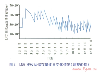 假設(shè)該LNG接收站LNG設(shè)計儲存規(guī)模為64×104m3 (4座16×104m3LNG儲罐),通過動態(tài)分析方法計算結(jié)果可知,每年需調(diào)整LNG船的船期,其中:2、3、5月份需各減少接收l船LNG;8、9、12月份需各增加接收l船LNG;其余月份仍保持每月接收2船LNG不變。通過調(diào)整船期方法得到的LNG接收站儲存量逐日變化情況見圖2.