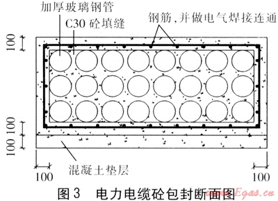 我們將電纜溝與輸氣管道交叉點兩側各10m以內(nèi)部分改為埋管(電纜在套管內(nèi)穿過)敷設,套管采用加厚玻璃鋼管并用鋼筋混凝土包封(現(xiàn)澆施工),并對鋼筋網(wǎng)作電氣焊接連通,見圖3。通信管道原設計就采用埋管形式,故只在交叉位置前后各10m采用與電力電纜相同的鋼筋混凝土包封,并對鋼筋網(wǎng)作電氣焊接連通。