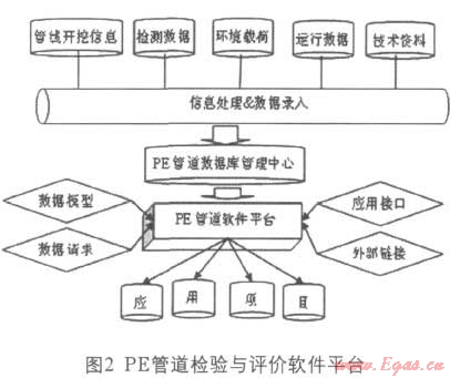 軟件平臺(tái)是IT技術(shù)在PE管道檢驗(yàn)與評(píng)價(jià)中的應(yīng)用?;跀?shù)據(jù)庫(kù)技術(shù)構(gòu)建PE管道信息數(shù)據(jù)庫(kù),有效管理PE管道數(shù)據(jù),從而實(shí)現(xiàn)管道信息共享,并利用信息數(shù)據(jù)庫(kù)編制PE管道風(fēng)險(xiǎn)評(píng)估系統(tǒng),構(gòu)建以風(fēng)險(xiǎn)檢驗(yàn)為核心的PE燃?xì)夤艿腊踩u(píng)價(jià)軟件應(yīng)用平臺(tái)。PE管道檢驗(yàn)與評(píng)價(jià)軟件平臺(tái)如圖2所示。