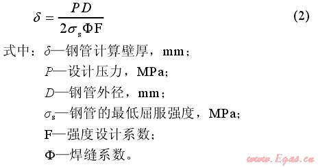 管道壁厚選取不僅要求滿足管道強(qiáng)度、穩(wěn)定性要求,同時(shí)應(yīng)滿足抗御外力破壞的要求。按照《城鎮(zhèn)燃?xì)庠O(shè)計(jì)規(guī)范》(GB50028—2006)的相關(guān)要求,直管段管壁厚度按公式(2)計(jì)算: