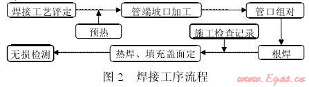 常用焊接方法有:手工電弧焊、埋弧自動(dòng)焊、氬弧焊、CO2氣體保護(hù)焊、等離子弧焊、電渣焊。高壓、次高壓管道主要采用的焊接方法:焊條電弧焊上向焊(手工焊)、焊條電弧焊下向焊(手工焊)、自動(dòng)保護(hù)藥芯焊絲電弧焊下向焊(半自動(dòng)焊)、熔化極氣體保護(hù)電弧焊下向焊(半自動(dòng)焊、機(jī)械化焊接),其焊接工序流程見圖2: