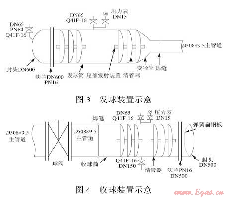 管道清掃干凈后進(jìn)行注水試壓,水壓試壓每段不宜超過35km,高差不宜超過30m,管道試壓注水時(shí),宜加隔離球,且應(yīng)保持一定的球前壓力,以排除管內(nèi)空氣,試壓合格后排盡試壓水并對(duì)管道進(jìn)行干燥,直至管內(nèi)空氣水露點(diǎn)比輸送條件下最低環(huán)境溫度低5℃,若管道封閉超過3個(gè)月未投產(chǎn),應(yīng)對(duì)管道進(jìn)行充氮?dú)獗Wo(hù)。下面以主管道D508×9.5為例,其發(fā)球裝置和收球裝置示意圖如下: