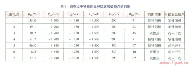 如果RIRC大于等于0.6,則可判斷此處金屬表面防腐層的電阻很小,預(yù)測為犧牲陽極;如果RIRC>1,則不排除此處管道上伴隨有防腐層破損情況;如果RIRC小于0.6,則表明此處金屬表面防腐層的絕緣電阻還比較大,可以判斷為防腐層破損。此處的0.6是一個經(jīng)驗性數(shù)值,按此判斷是否精準(zhǔn),還需要更多的實踐來證實。根據(jù)此方法,對7處漏電點的判斷結(jié)果見表2。