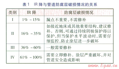 IR降越大,陰極保護(hù)程度越低,即埋地管道防腐層缺陷面積越大,可見DCVG能夠較準(zhǔn)確地預(yù)測防腐層缺陷的面積,并能對整個管道的陰極保護(hù)效果做出客觀的判斷。IR降與防腐層破損情況的關(guān)系見表1。