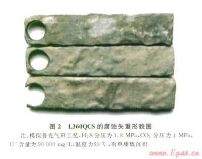 普光氣田優(yōu)選L360QCS抗硫管線鋼作為集輸系統(tǒng)管材,針對其集輸系統(tǒng)實際工況,開展了一系列腐蝕速率、SSC以及HIC試驗,并進行緩蝕劑評價試驗[4],試驗條件:H2S分壓l.8 MPa,CO2分壓1MPa,模擬普光氣田地層水情況,其中Cl-含量為90 000 mg/L。照標準NACE TM0177-2005和ISO 3183-3及模擬工況下條件進行試驗,評價結(jié)果表明:L360QCS抗硫管線鋼均表現(xiàn)出較好的耐SSC和HIC性能,但存在較為嚴重的電化學腐蝕,平均腐蝕速率為0.4mm/a,因此,需要采取抑制電化學腐蝕的措施。