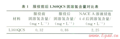 集氣站內(nèi)管道運行l年后,截取站內(nèi)管道進行力學性能測試,確定其性能變化情況。將運行后的管材進行NACE的標準HIC和SSC試驗,均未出現(xiàn)開裂。對比測量服役前后以及NACE A溶液浸泡后材料內(nèi)固溶氫含量發(fā)現(xiàn)(表1),服役后管材固溶氫含量雖有所增加,但遠小于在NACE A溶液腐蝕4 d以后管材內(nèi)的固溶氫含量。說明即使在高含硫工況條件下,氫滲透也遠未達到飽和,管材氫損傷情況不嚴重。