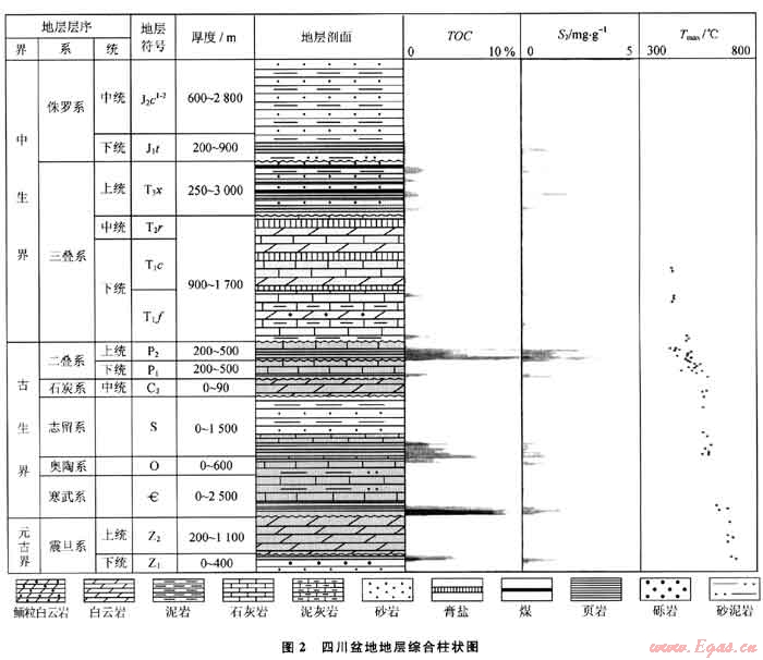 泥頁巖可形成于陸相、海相及海陸交互相沉積環(huán)境中,暗色泥頁巖主要形成于缺氧的閉塞海灣、淘湖、湖泊深水區(qū)、欠補(bǔ)償盆地及深水陸棚等沉積環(huán)境中(姜在興,2003;張愛云等,1987)。碳質(zhì)頁巖常與煤系伴生,一般出現(xiàn)在煤層的頂、底板或夾層中,以湖泊、沼澤環(huán)境沉積為主。石炭紀(jì)-二疊紀(jì)、三疊紀(jì)-侏羅紀(jì)和古近紀(jì)-新近紀(jì)為中國3次主要的成煤期,發(fā)育多套與煤層相伴生的碳質(zhì)頁巖。如中國南方地區(qū)的二疊系龍?zhí)督M(P2l)碳質(zhì)頁巖分布面積較廣,厚度介于200~300m;中國南方揚(yáng)子地塊、華北地塊及塔里木地塊古生界海相泥頁巖以深水陸棚相沉積為主,如四川盆地古生界發(fā)育多套黑色泥頁巖(圖2),寒武系筇竹寺組、志留系龍馬溪組泥頁巖為大陸邊緣坳陷的深水陸棚相沉積,厚度介于200~400m,含豐富的有機(jī)質(zhì)、筆石等海洋浮游生物化石及白生黃鐵礦等;中國陸相沉積盆地中,松遼盆地白堊系、渤海灣盆地古近系、四川盆地三疊系、鄂爾多斯盆地三疊系等發(fā)育多套湖相、湖沼相黑色泥頁巖,含豐富的介形蟲、孢粉、細(xì)菌、高等植物等化石及有機(jī)質(zhì),厚度介于200~1500m。