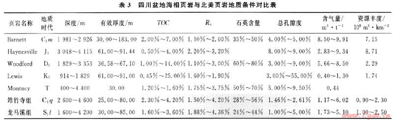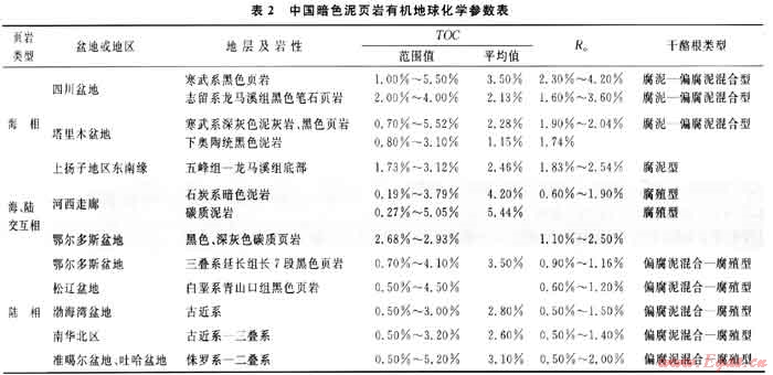 中國暗色泥頁巖分布時(shí)代多、面積較廣,就全國而言從震旦系-新近系均有分布,區(qū)域上遍及全國。從沉積環(huán)境上講,由海相一海、陸交互相-陸相均發(fā)育較厚的暗色泥頁巖。暗色泥頁巖有機(jī)質(zhì)含量、熱演化程度等指標(biāo)與美國主要暗色泥頁巖有不少相似之處(表4~6)。