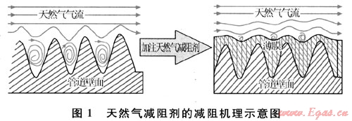 天然氣減阻劑的減阻機理是將稱作“天然氣減阻劑”的化學(xué)品注入天然氣管道中,通過天然氣減阻劑分子中的極性基團對鋼鐵表面的吸附,形成一層彈性分子薄膜。這種具有彈性的吸附薄膜緊緊吸附在管壁內(nèi)表面,使得管壁表面的凹陷、溝槽被填塞,實際上又形成了一層新的彈性壁面。天然氣氣流在輸送過程中與新形成的較平滑的彈性薄膜壁面相接觸,不再與原有粗糙不平的金屬管道內(nèi)壁接觸,這樣天然氣氣流與管壁之間的摩擦減小,流動阻力大大降低,從而達到輸氣管道減阻的目的嘲。天然氣減阻劑的減阻機理示意圖如圖1所示。