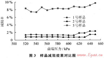 從圖3可以看出,在相同實驗條件下,溶劑丙酮的用量為800mL,1號樣品僅含有5g PASMT成膜劑,其減阻率平均為1.5%;2號樣品僅含有100mL協(xié)同成膜助劑,其減阻率平均為0.9%;3號樣品為5g PASMT成膜劑與100mL協(xié)同成膜助劑復(fù)配的混合物,其減阻率平均為8.4%。復(fù)配后樣品的減阻率遠遠高于各組分單獨使用時的減阻率,表明PASMT成膜劑與協(xié)同成膜助劑產(chǎn)生了很大的協(xié)同減阻作用。
