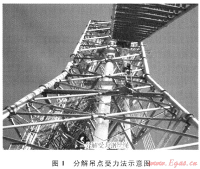 根據(jù)放空火炬塔架的結(jié)構(gòu)特點,整體吊裝放空火炬的吊點最適合設置在距塔架底部42m的塔架橫梁處,該處的塔架主肢為乃450mm×12mm鋼管,橫梁為Φ159mm×6mm無縫鋼管。為了在吊耳梁上安裝能滿足吊裝要求的吊耳,需將Φ159mm×6mm橫梁更換為DN400mm或DN350mm的厚壁鋼管,但現(xiàn)場只有Φ356mm×16mm(20號鋼)的無縫鋼管,且土庫曼斯坦資源匱乏,無法采購到合適的吊耳梁材料,從國內(nèi)采購、運輸?shù)闹芷谟趾荛L,無法滿足工期要求。經(jīng)計算,若采用Φ356mm×16mm的無縫鋼管制作吊耳梁,其與吊耳相貫處的彎曲應力達到586MPa,是其許用應力(137MPa)的4倍多,達不到吊裝要求。在此情況下,經(jīng)過技術(shù)論證和可行性研究,決定使用Φ356mm×16mm的無縫鋼管制作吊耳梁,并采用分解吊點受力的方法,以降低吊耳梁的彎矩和應力。具體方法是用鋼絲繩把吊耳和吊點下部34m標高的塔架主肢節(jié)點連接起來,并對鋼絲繩施加3t預拉力,將超過吊耳梁承受能力的吊裝負荷通過鋼絲繩傳遞到34m標高的塔架主肢節(jié)點上,鋼絲繩的大小通過超載負荷計算得出。分解吊點受力法示意圖如圖1所示。
