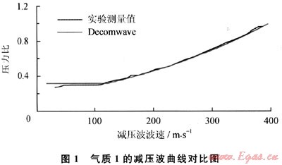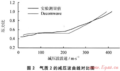 圖1為氣質(zhì)1減壓波波速計(jì)算結(jié)果與文獻(xiàn)實(shí)驗(yàn)數(shù)據(jù)的對(duì)比圖,初始?jí)毫?0.58MPa,溫度為-25.59℃。圖中“實(shí)驗(yàn)測(cè)量值”指本文參考文獻(xiàn)[6]中通過(guò)實(shí)驗(yàn)測(cè)得的數(shù)據(jù),“Decomwave”為開發(fā)軟件計(jì)算的減壓波波速結(jié)果。