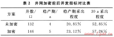 在完成歷史擬合的基礎上,對考慮阻流帶的模型進行了計算,得到了更加準確的氣藏剩余氣分布,Eclipse軟件能夠定量顯示每個網(wǎng)格單元剩余天然氣的地質儲量。以此為基礎,尋找儲量動用程度低的“甜點”進行局部加密。設計14口加密井,方案預測指標見表2。從表2中可以看出:井網(wǎng)加密后,儲量動用程度提高,氣田采收率增加了4.41%。