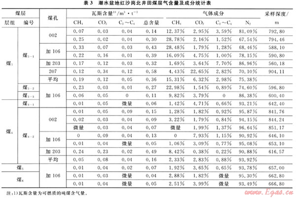 根據(jù)紅沙崗煤礦煤孔瓦斯測定,煤層甲烷(瓦斯)含量非常低,均以氮?dú)鉃橹?表3[5]);上部煤1層(組)瓦斯含量比煤4、煤5和煤6層(組)高,尤其是煤1-1層甲烷含量是其他煤層的幾倍到幾十倍,可能是煤1-1層直接頂板油頁巖起到的封閉作用最好。