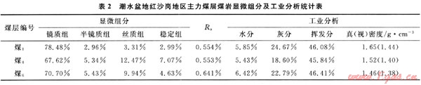 紅沙崗地區(qū)煤層以光亮、半亮型煤為主,鏡煤、亮煤、暗煤?;映霈F(xiàn)[5];煤巖顯微組分以鏡質(zhì)組為主(表2),一般超過80%,惰性組很少,殼質(zhì)組含量較高,為3%~8%,對煤層氣的生成有利。