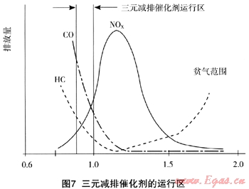 N0x減排催化劑可保證汽油發(fā)動(dòng)機(jī)能按化學(xué)計(jì)量比運(yùn)行。用一個(gè)O2敏感元件放置在催化劑的下游方(離開發(fā)動(dòng)機(jī)),敏感元件向電控組件提供信號(hào),調(diào)節(jié)進(jìn)入汽缸的燃料量。