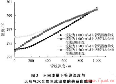 由圖3可以看出,隨著壓力的增加,天然氣水合物的生成溫度逐漸增高。流量增大后,管線溫度曲線明顯上移,且受外界環(huán)境溫度的影響減弱,這是因?yàn)榱魉偌涌旌罅黧w與外界環(huán)境之間的熱交換時(shí)間減少所致;而此時(shí)天然氣水合物生成溫度曲線卻有輕微的下移,這是因?yàn)榱髁吭龃蠛螅Σ翐p失增大,導(dǎo)致管線內(nèi)對(duì)應(yīng)點(diǎn)的壓力減少。也就是說(shuō),流量增大導(dǎo)致2條曲線向相反的方向發(fā)展,因而,可以通過(guò)調(diào)整流量來(lái)實(shí)現(xiàn)管線的正常傳輸。在上例中,流量不能低于1500m3/d,這樣才能保證該管線的正常傳輸。