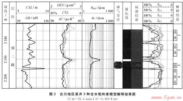 準(zhǔn)確計(jì)算含水飽和度是低孔低滲儲(chǔ)層定量評(píng)價(jià)的難題之一。目前,泥質(zhì)砂巖儲(chǔ)層中根據(jù)泥質(zhì)分布形式建立的含水飽和度模型有30多種,廣泛用于泥質(zhì)砂巖含水飽和度公式大多采用體積模型與電阻并聯(lián)及Archie公式,并作不同假設(shè),都帶有經(jīng)驗(yàn)性[1]。對(duì)不同地區(qū)、不同儲(chǔ)層特征、不同地層水條件下若不加以研究會(huì)使求取的含水飽和度誤差很大。合川地區(qū)須二段氣藏儲(chǔ)層屬低孔低滲,孔喉結(jié)構(gòu)復(fù)雜、地層水礦化度高、束縛水飽和度高等特征,導(dǎo)致儲(chǔ)層含水飽和度定量評(píng)價(jià)困難,而目前又沒有完全適用于各種儲(chǔ)層的含水飽和度模型,出現(xiàn)儲(chǔ)量計(jì)算不準(zhǔn)、氣水分布認(rèn)識(shí)不清、流體性質(zhì)判別符合率低和產(chǎn)能預(yù)測困難等難題[2~3]。研究適用研究區(qū)復(fù)雜地質(zhì)條件下的含水飽和度解釋模型,提高含水飽和度解釋精度成為當(dāng)務(wù)之急,能為川中地區(qū)低孔滲砂巖氣藏勘探開發(fā)提供有力支持。