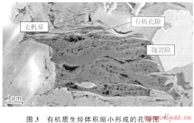 目前有研究認(rèn)為,頁巖中的孔隙以有機(jī)質(zhì)生烴形成的孔隙為主(圖3)。據(jù)Jarvie等人研究,有機(jī)質(zhì)含量為7%的頁巖在生烴演化過程中,消耗35%的有機(jī)碳可使頁巖孔隙度增加4.9%[18]。有機(jī)微孔的直徑一般為0.01~1μm。