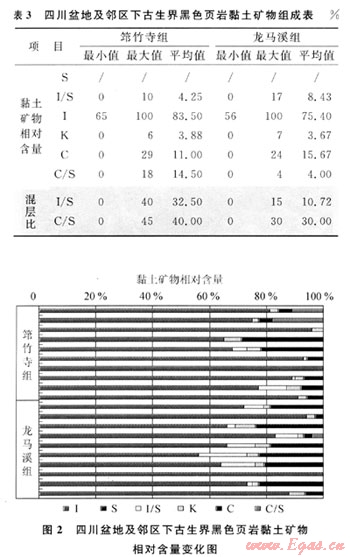 Bowker研究認(rèn)為,Barnett頁巖層中黏土礦物主要為微含蒙皂石的伊利石[10]。四川盆地及鄰區(qū)筇竹寺組和龍馬溪組頁巖儲(chǔ)層黏土礦物分析結(jié)果也表明其組成主要是伊利石,其次為綠泥石,不含蒙皂石,有少量的高嶺石和伊/蒙混層(表3、圖2)。筇竹寺組的伊利石含量較龍馬溪組高,平均值為83.5%,I/S混層比在0~40%,平均為32.5%;龍馬溪組的綠泥石平均含量為15.67%,I/S混層比平均為10.72%。