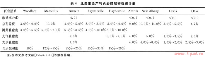 北美地區(qū)頁巖氣儲(chǔ)層物性評(píng)價(jià)采用了美國天然氣研究所(1996)研制的GRI頁巖巖心測定方法。該方法不僅可以測定頁巖基質(zhì)總的孔隙度,還可以測定出含氣孔隙度,且測定出的頁巖滲透率最低可達(dá)10-14mD[11]。國內(nèi)目前不具備此技術(shù),只能按常規(guī)儲(chǔ)層物性分析方法測試,故不能與北美頁巖物性進(jìn)行比對(duì)。