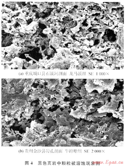 筆者在研究中亦發(fā)現(xiàn)黑色頁巖中顆粒被溶蝕的現(xiàn)象(圖4)。掃描電鏡下溶蝕孔孔徑為15~20μm,孔緣不規(guī)則。上述孔隙的觀察依賴于微米一納米級(jí)電子顯微鏡分析技術(shù)。