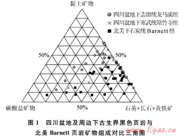 美國5大含氣頁巖的有機(jī)碳含量均較高,其中Barnett頁巖有機(jī)碳含量介于2.0%~7.0%,平均為4.5%,Antrim頁巖和New Albany頁巖有機(jī)碳含量部分超過20%,吸附氣含量最低為13%,最高可達(dá)70%(表1)。筆者依據(jù)四川盆地最新淺井及露頭分析資料,對(duì)該區(qū)下寒武統(tǒng)筇竹寺組和下志留統(tǒng)龍馬溪組頁巖進(jìn)行分析,結(jié)果顯示筇竹寺組有機(jī)碳含量為1.0%~11.07%,普遍大于1%;龍馬溪組的有機(jī)碳含量一般分布在0.51%~4.88%,最高可達(dá)9%左右??梢酝茰y,四川盆地下古生界2套頁巖吸附氣含量應(yīng)該是較高的。