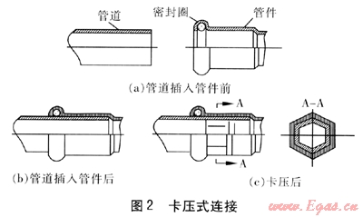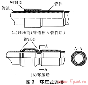 卡壓式連接是將“0”型密封圈,用專用卡壓工具壓入連接處,鉗壓后斷面呈六邊形的一種擠壓式連接方式。其優(yōu)點(diǎn)是操作方便,易于安裝;缺點(diǎn)是連接強(qiáng)度不夠高,抗外力能力差。卡壓式連接見圖2。