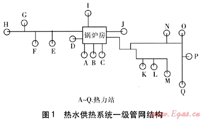 該供熱系統(tǒng)采用燃煤鍋爐房集中供熱,提供熱水、蒸汽兩種供熱介質(zhì),總供熱面積為132.02×104m2,其中熱水供熱面積為104.8×104m2。本次測(cè)量對(duì)象為熱水供熱系統(tǒng),采用間接連接,調(diào)節(jié)方式為質(zhì)調(diào)節(jié)。熱水供熱系統(tǒng)包括17座熱力站,其中有6座小區(qū)熱力站,11座樓宇熱力站,一級(jí)管網(wǎng)結(jié)構(gòu)見(jiàn)圖1。一級(jí)管網(wǎng)是隨著不同建筑的建設(shè)分期敷設(shè)的,新舊管網(wǎng)交錯(cuò)布置,采用閉式雙管系統(tǒng),布置成枝狀管網(wǎng)。一級(jí)管網(wǎng)采用的保溫材料包括礦棉、復(fù)合硅酸鹽、聚氨酯,敷設(shè)方式有管溝和直埋兩種,大部分采用管溝敷設(shè)。